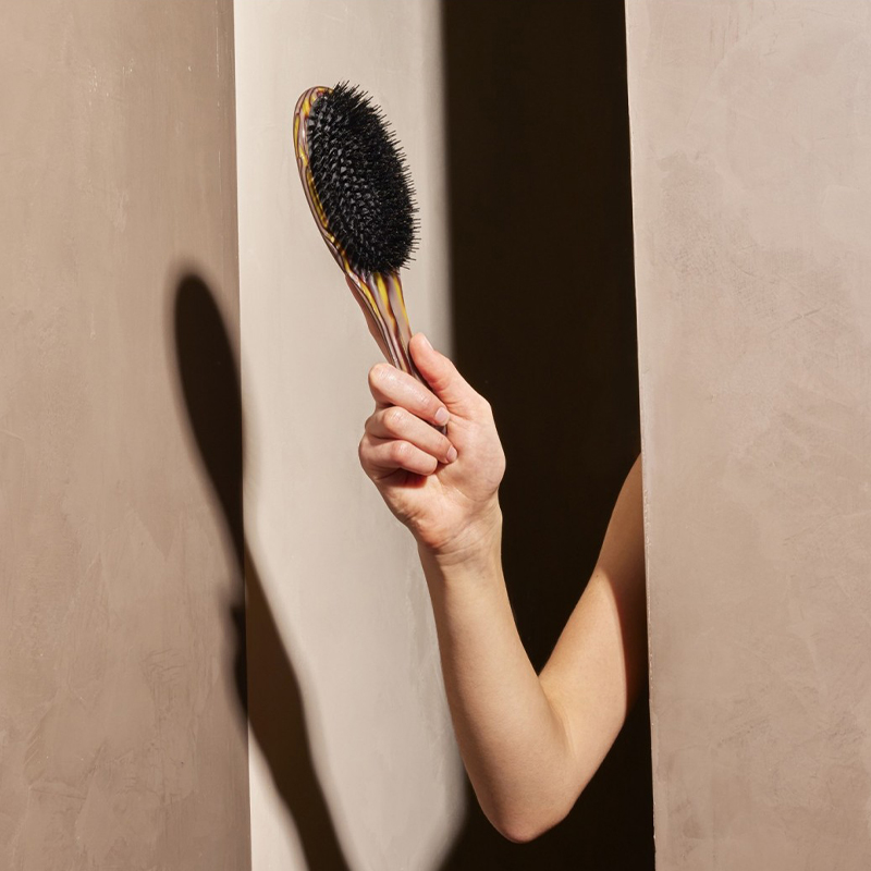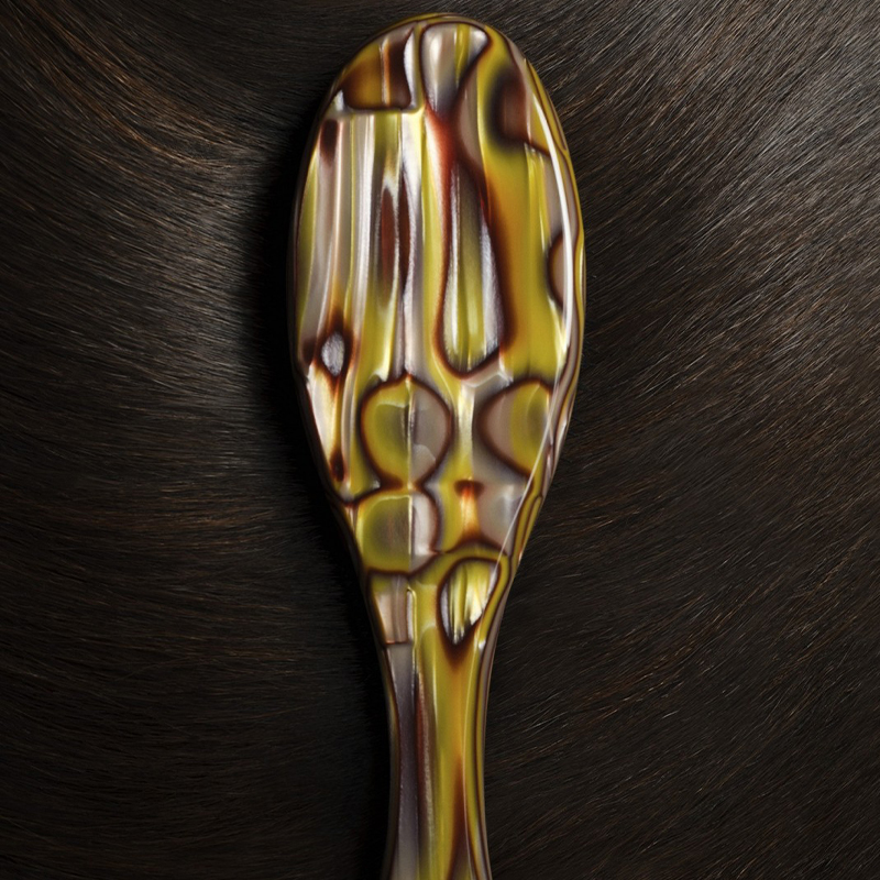 Nuestro Flat Brush está hecho con resina italiana de diseño personalizado y combina un diseño artesanal con un mango ergonómico para un agarre perfecto y un peso equilibrado. Este cepillo cuenta con una mezcla de cerdas de jabalí y pasadores de nailon redondeados con una almohadilla de caucho natural al 97 % para estimular delicadamente el cuero cabelludo y dar brillo al cabello para lograr un acabado ultraliso y brillante.